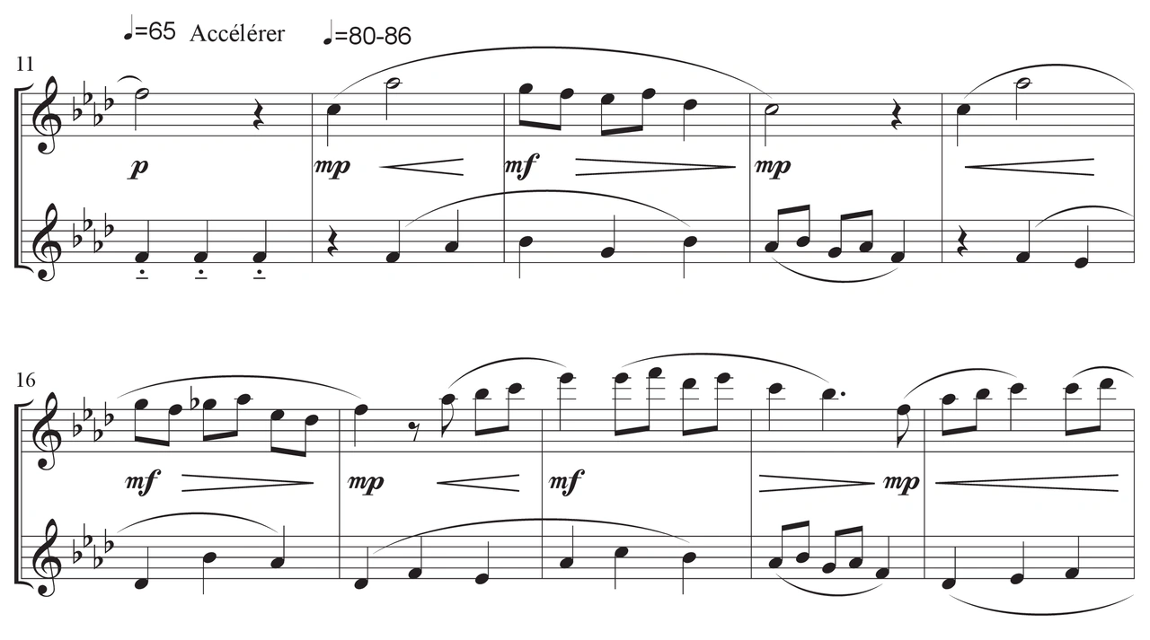 Dyade verte is the second movement of a piece calls Les Dyades in 3 movements for flute and violin or other instruments.