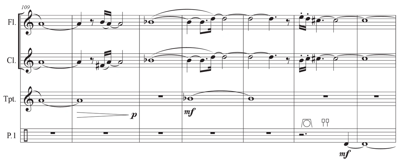 To do this, I used ascending and descending chromatic patterns, a technique often used by this composer. Subsequently, I transformed this film music into a composition for a large orchestra.