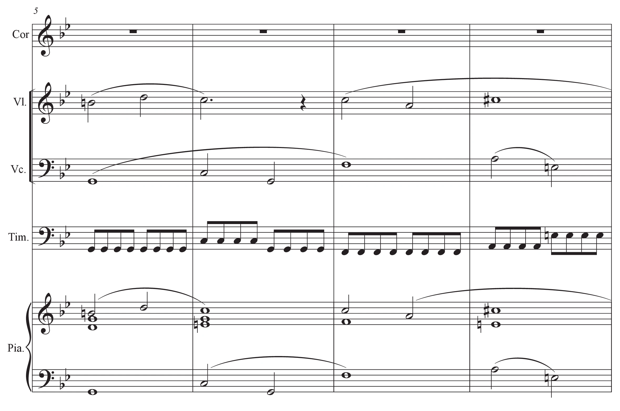 For horn, timpani, piano or keyboard 1 to 3 violins and 1 to 2 cellos.