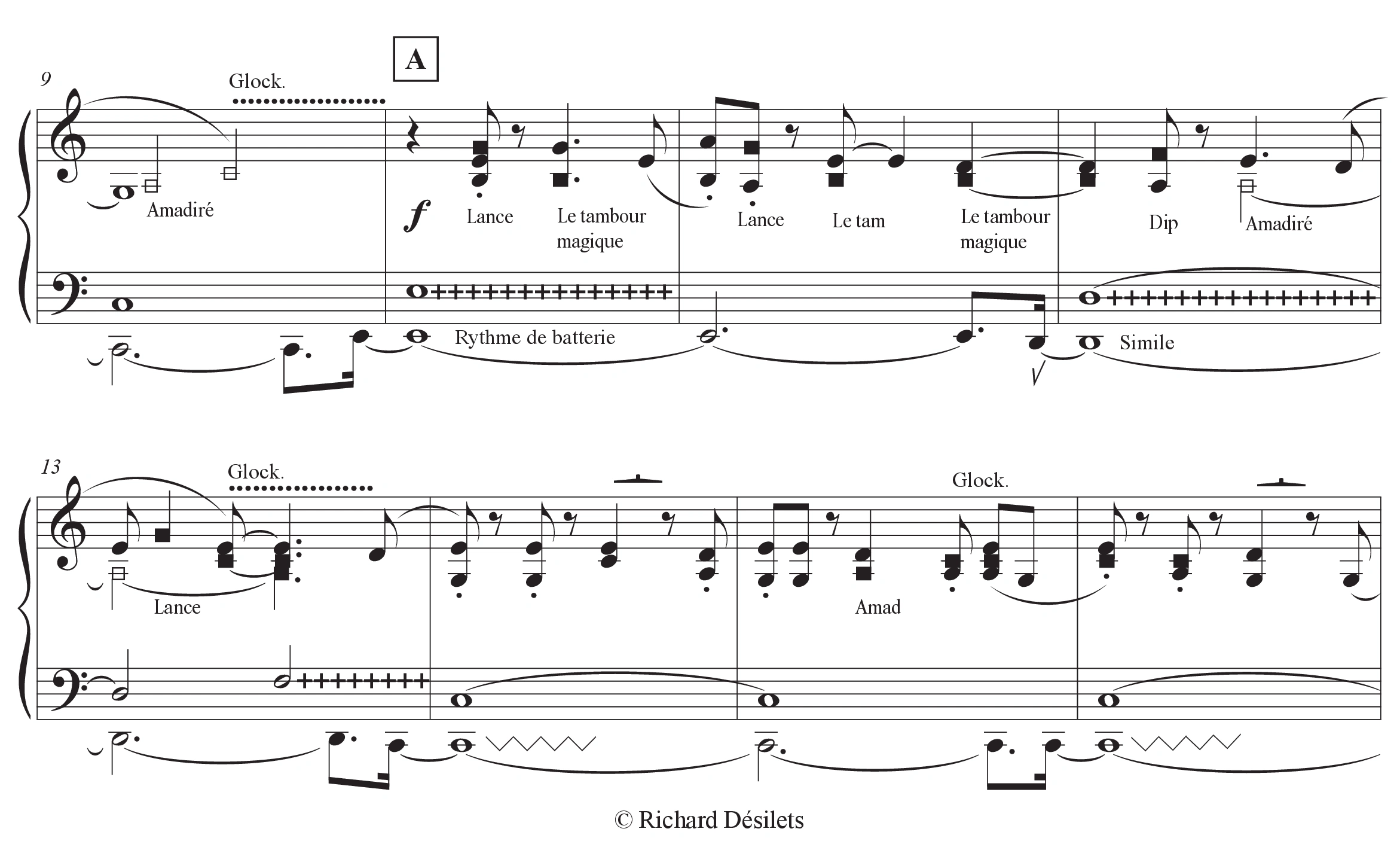 The Nord Stage 3 keyboard program and score are available for download at the Canadian Music Center or by contacting the composer at the following email address, ric.desilets@gmail.com